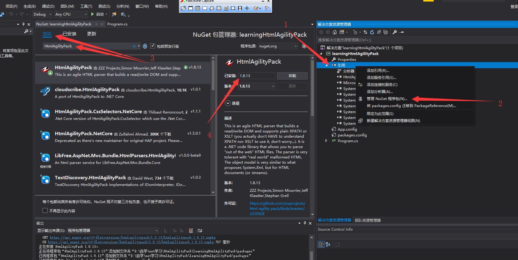 (2)选中引用右键-->点击 管理NuGet程序包-->点击浏览-->搜索HtmlAgilityPack